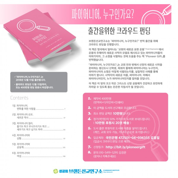 브랜든선교연구소는 [파이어니어, 누구인가요?] 번역 출간을 위해크라우드 펀딩을 진행합니다.