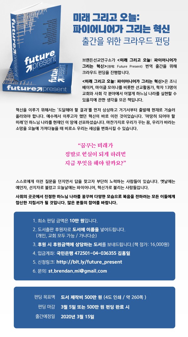 브랜든선교연구소가 <미래 그리고 오늘: 파이어니어가 그리는 혁신>(원제: Future Present) 번역 출간을 위해 크라우드 펀딩을 진행합니다.