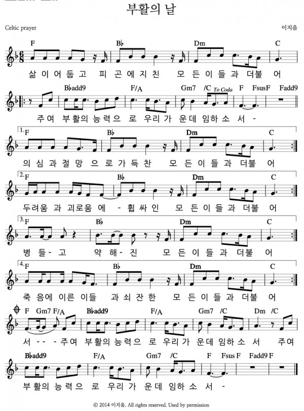 2014년 사순절기 즈음에 켈틱매일기도로 묵상을 하다가 주일_부활의 날 기도문 중에서 저녁: 맡기는 기도 중 세상과 이웃을 위한 기도를 노래로 만들어야 겠다는 생각을 했다. ‘주여, 부활의 능력으로 우리 가운데 임하소서’라는 대구보다 그 앞에 놓인 상황들, 삶이 어둡고 피곤에 지친, 의심과 절망으로 가득 찬, 두려움과 괴로움에 휩싸인, 병들고 약해진, 죽음에 이르고 쇠잔한, 이 표현들이 당시의 내 상황, 내 주위 사람들의 상황, 밀려나고 배제된 사람들의 상황을 말해주고 있다고 느껴졌기 때문이었다.